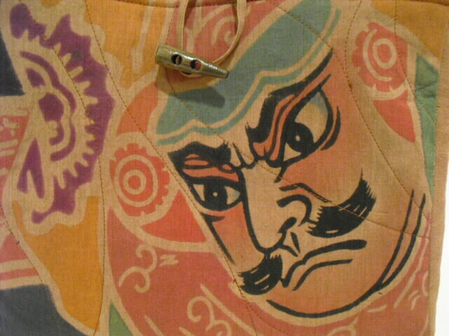 古布の武者絵幟旗を柿渋で染色してバックへリメイクした作品です。