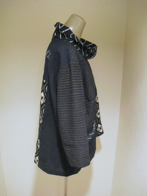 ポケットは左右に深さ12.5cm×口幅12.5cmが付いています。 ポケット口にも型染め布をアクセントに使いました。 型染め布で作った衿も特徴的。 女性らしいロールネックで9cmのスタンド付です。 衿を立てたり、折ったりと自由にアレンジして衿元のオシャレをお楽しみください。 袖は七部袖です。