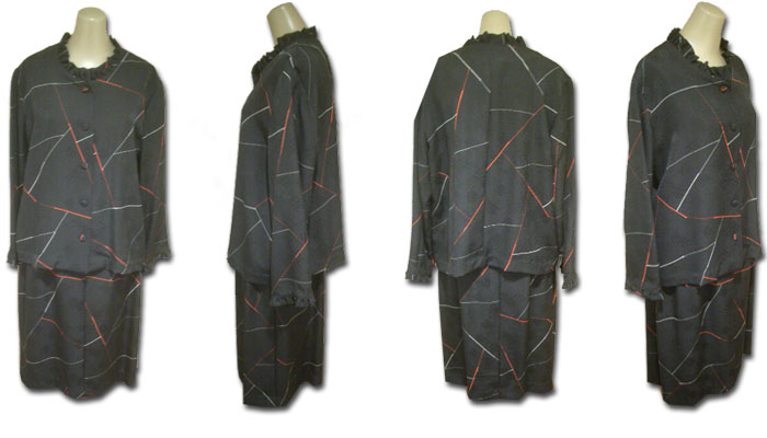 素材・・・正絹出来上り寸法 (11号サイズ) 上衣 : 着丈 54cm、胸囲 105cm、袖丈 54cm、肩幅 41cm、袖口幅 13.5cm スカート : スカート丈 59cm、ウェスト(一部ゴム)66〜73cm、ヒップ 105cm 価格 29,000円(税込・ 送料込)