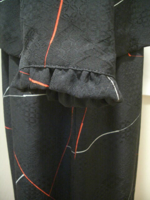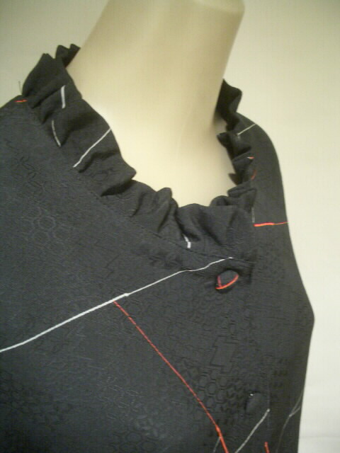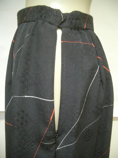 正絹の羽織の着物をリメイクした素敵なスーツです。正絹はシワになりにくいのが特徴でとても軽く着心地が良いです。黒地ベースの清楚な全体的イメージに白と赤のラインが鮮やかです。上衣は衿ぐりに3cm、袖ぐりに2cmのフリルを付け可愛いらしさを出しました。直径1.5cmのくるみボタン5個を付けています。スカートはフォーマルなシーンにも合うシンプルなミディースカート。ウェストに20cmのコンシールファスナーを入れています。ウェストは両脇にゴムが入っていますのでウェストサイズに柔軟に対応できます。落ち着いた色合いで上品なこのスーツは卒業式や入学式、結婚式、パーティーなどにぴったりです。