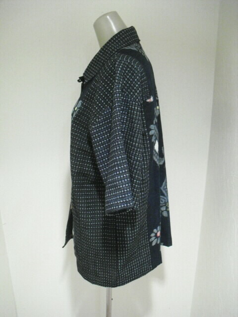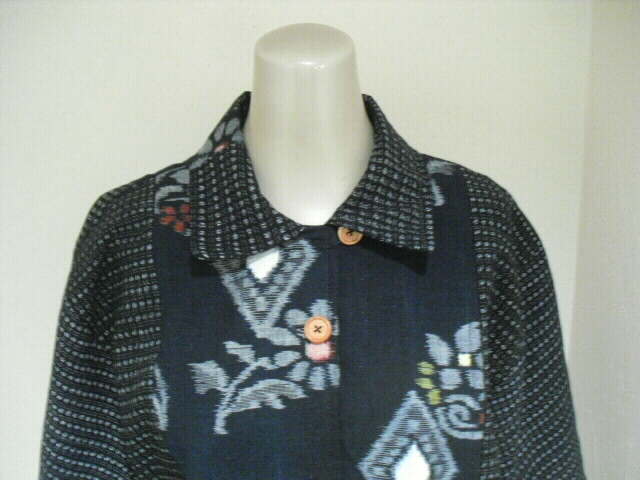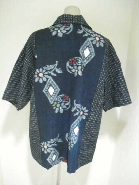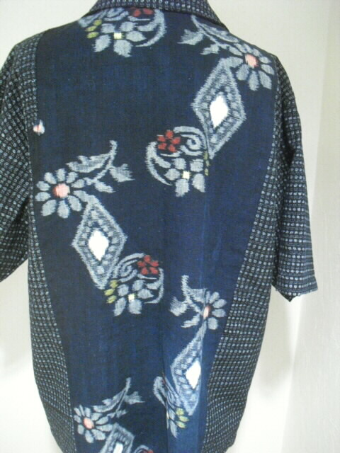 菱形と花柄の絵絣です。 藍色の洋服の中に白色、黄色、赤色の絣糸がとても可愛いアクセントになっています。