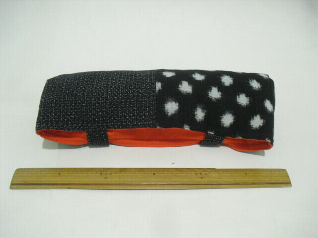 持ち手の紐も絣です。 中は赤布で裏地とポケットを付けています。