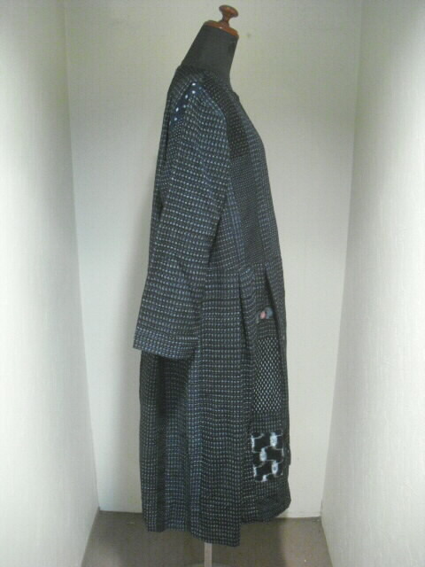 古布の絣(かすり)を組合わせて作った長袖ワンピースです。