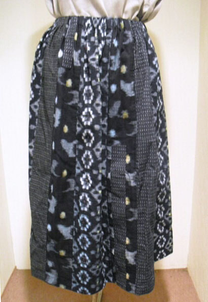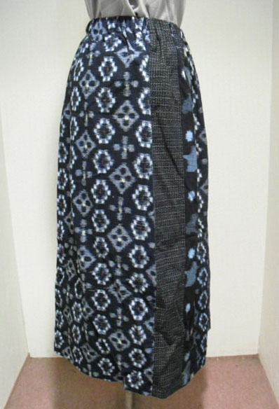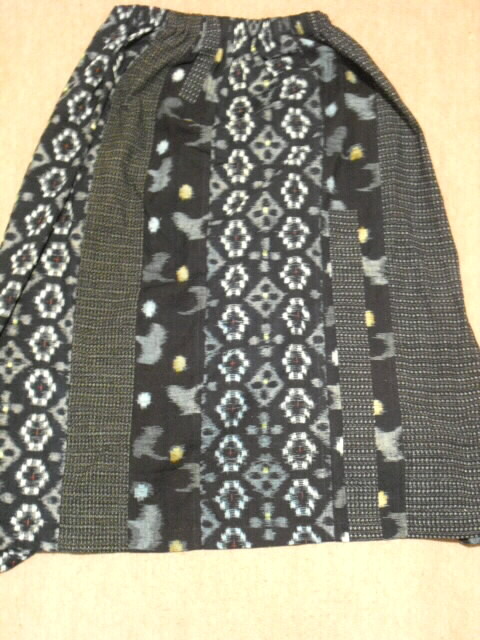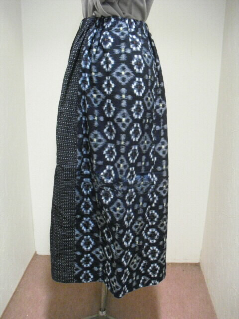 女性らしく可愛いいシルエットがでるように裾幅は広めに取りました。全体的な雰囲気のまま、ふんわりと着てください。 数種類の絣を使いおもしろくパッチした個性的なスカートです。黄色の女絣がポイントになって可愛らしさを出しています♪