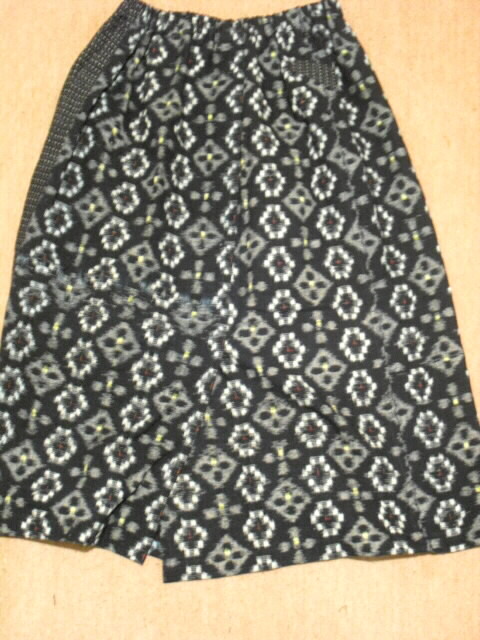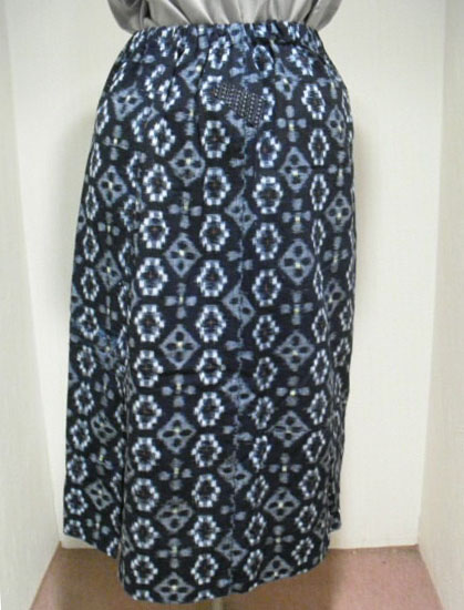 人気の古布の絣をたっぷり使ったすごく贅沢なスカートです。ウエストは総ゴムで58cm〜100cmまで対応。細めの方もちょっとふくよかな方も、ゆったりとした履き心地ではいていただけます。デザインはオーソドックスなウエストゴムのギャザースカートです。ギャザースカートですので、どこが前に着てもかまいません。全方向お好きな方向で着用してください。
