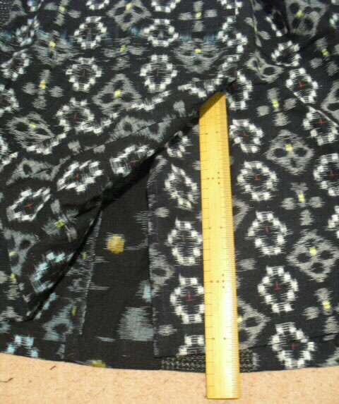 人気の古布の絣をたっぷり使ったすごく贅沢なスカートです。古布ならではの大変柔らかい手触りです。デザインはオーソドックスなウエストゴムのギャザースカート。数種類の絣を使いおもしろくパッチした個性的なスカートです。黄色の女絣がポイントになって可愛らしさを出しています♪歩きやすいように長さ26cmのスリットを入れています。ウエストは総ゴムで58cm〜100cmまで対応。細めの方もちょっとふくよかな方も、ゆったりとした履き心地ではいていただけます。 女性らしく可愛いいシルエットがでるように裾幅は広めに取りました。全体的な雰囲気のまま、ふんわりと着てください。