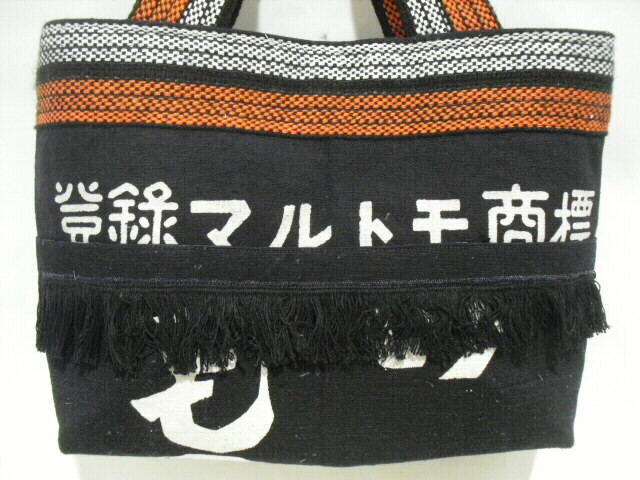 表と裏は、違った絵柄になっていますので両面で違う表情も楽しめます。持ち手も前掛けの紐を使いました。生地は丈夫ですが、柔らかく手に優しい持ち手です。バッグ用の硬めの芯を使っていますのでカッチリとしっかりしています。開け口はマグネットボタンで留められます。開け口は大きく開きますので大きな荷物も持ち運びできます。中には深さ17cmのポケットが1個付いています。ちょっとしたお出かけやご旅行に・・・周りの視線を惹きつける個性的なデザイン♪お洒落な手づくり一点モノのバックです。価格 9,500円
