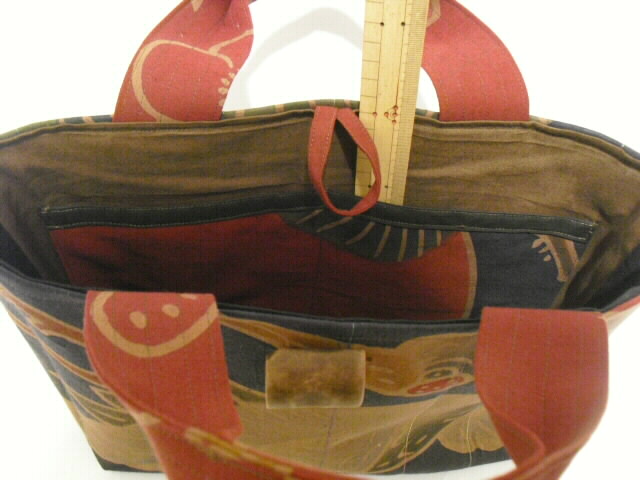 表と裏は、違った絵柄になっていますので両面で違う表情も楽しめます。バッグ用の硬めの芯を使っていますのでカッチリとしっかりしています。開け口はボタンで留められます。木のボタンがバッグにとてもマッチ♪開け口は大きく開きますので大きな荷物も持ち運びできます。バッグの中は幟旗の家紋部分を使用しています。中には深さ15cmのポケットが2個付いています。ちょっとしたお出かけやご旅行に・・・周りの視線を惹きつける個性的なデザイン♪お洒落な手づくり一点モノのバックです。価格 9,500円