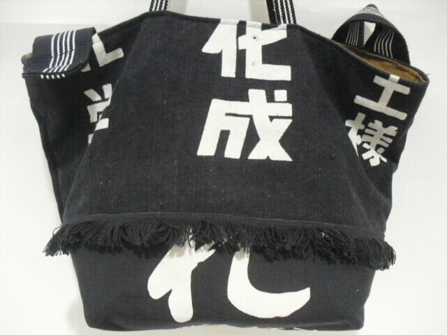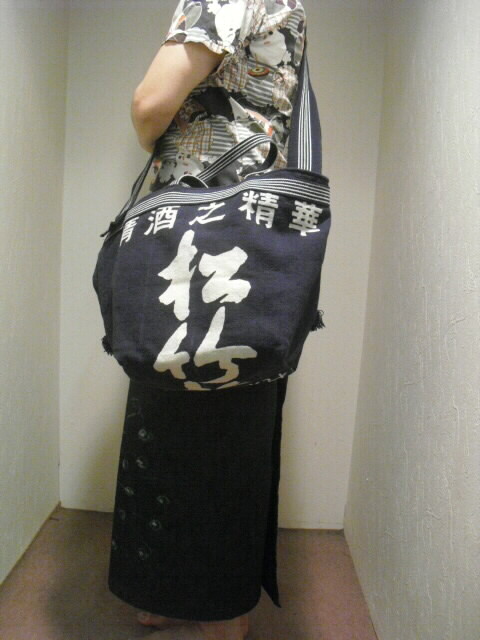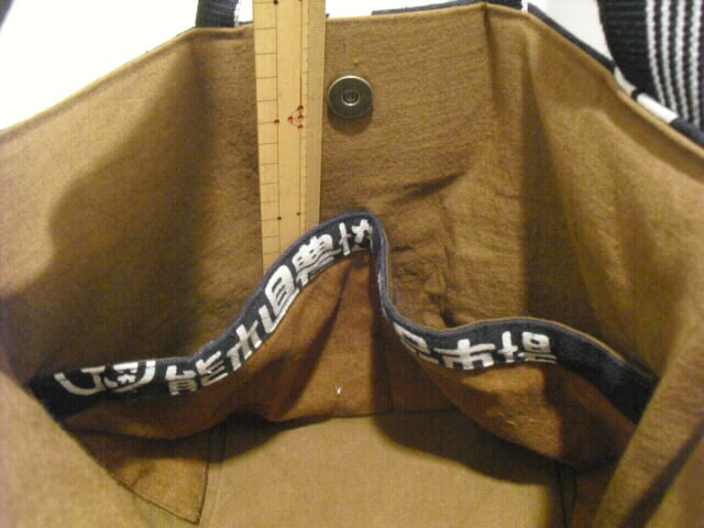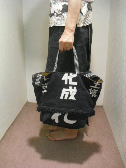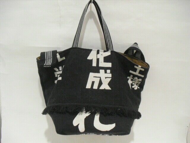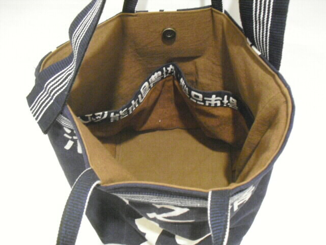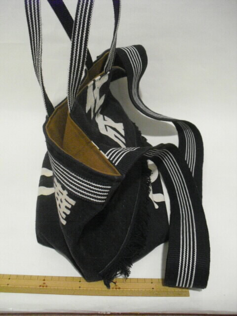 薄い底板が入っています。生地が丈夫ですので接着芯は貼っていません。小さく折りたたむことができます。開け口は開閉がラクなマグネットボタン。開け口は大きく開きますので大きな荷物も持ち運びできます。中には深さ26cmの大きなポケットが2個付いています。裏地は柿渋染めした綿生地を使っています。ちょっとしたお出かけやご旅行に・・・周りの視線を惹きつける個性的なデザイン♪お洒落な手づくり一点モノのバックです。価格 9,500円