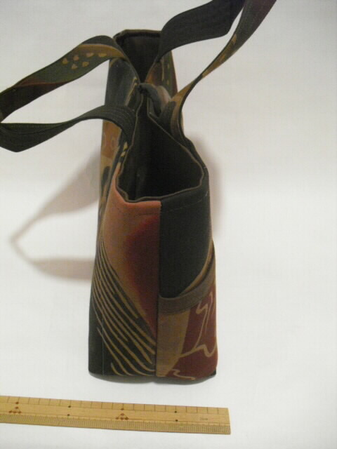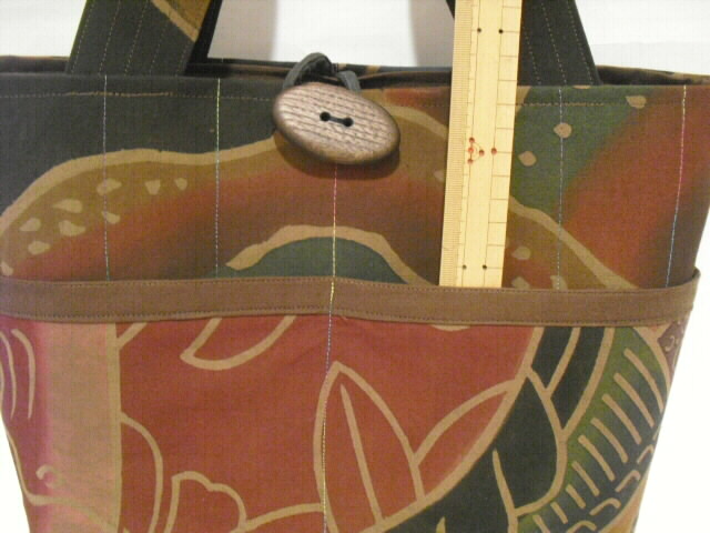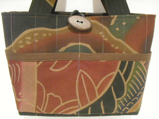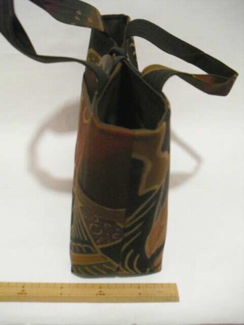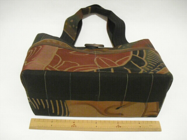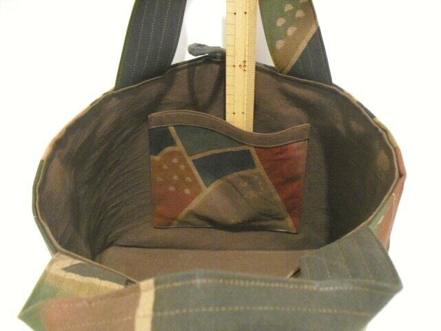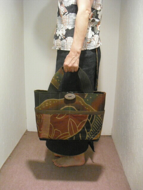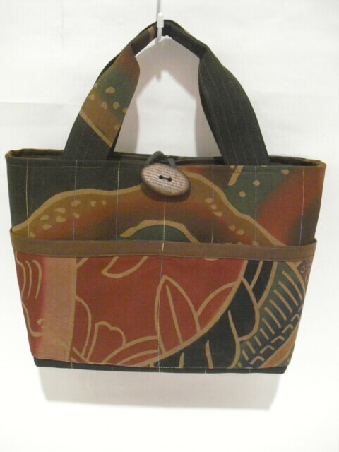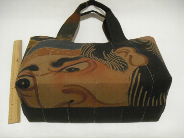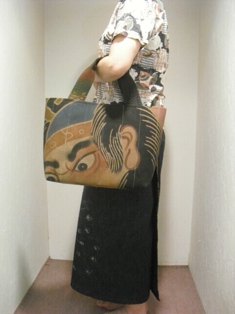 素材・・・バック本体、持ち手:古布 武者絵のぼり旗(綿) サイズ・・・幅29.5cm×高さ25cm×底幅13cm持ち手・・・長さ38cm重さ・・・349g特徴・・・古布の武者絵幟旗を染色して手さげバックへリメイクしました。古布の幟旗は大変、希少価値の高い素材です。表と裏は、違った絵柄になっていますので両面で違う表情も楽しめます。外側は深さ14cmの貼り付けポケットになっています。ポケットは2カ所で仕切っていますので分別収納に便利です。バッグ用の硬めの芯を使っていますのでカッチリとしっかりしています。開け口はボタンで留められます。木のボタンがバッグにとてもマッチ♪開け口は大きく開きますので大きな荷物も持ち運びできます。中には深さ15cmのポケットが1個付いています。ちょっとしたお出かけやご旅行に・・・周りの視線を惹きつける個性的なデザイン♪お洒落な手づくり一点モノのバックです。価格 9,800円