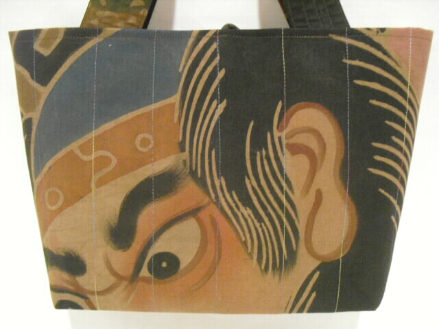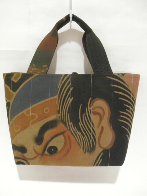 古布の武者絵幟旗を染色して手さげバックへリメイクしました。古布の幟旗は大変、希少価値の高い素材です。外側は深さ14cmの貼り付けポケットになっています。ポケットは2カ所で仕切っていますので分別収納に便利です。表と裏は、違った絵柄になっていますので両面で違う表情も楽しめます。