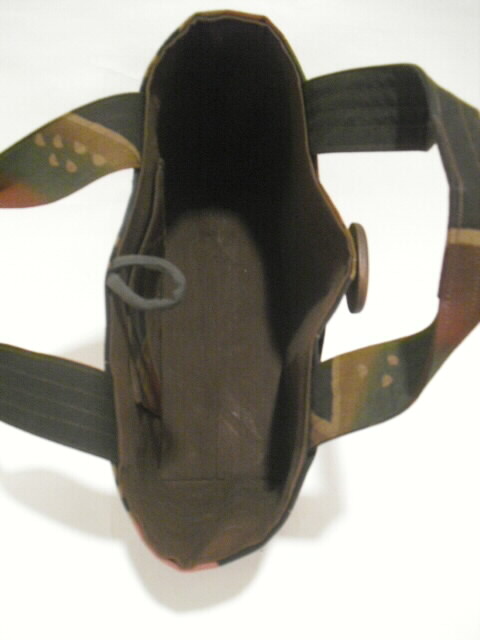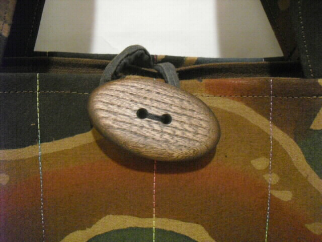 開け口は大きく開きますので大きな荷物も持ち運びできます。開け口はボタンで留められます。木のボタンがバッグにとてもマッチ♪