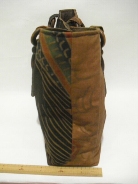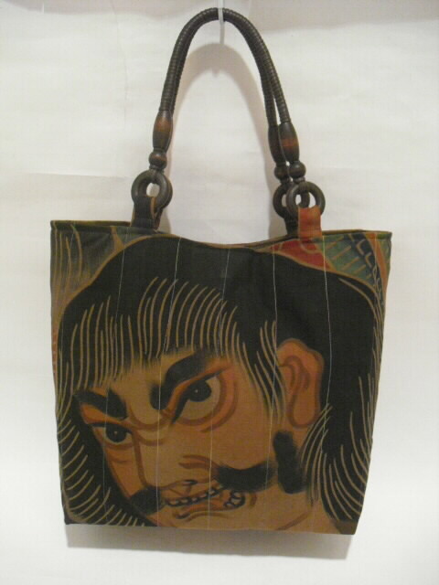 素材・・・バック本体:武者絵のぼり旗(綿) 、持ち手:コード紐とウッドビーズサイズ・・・幅33cm×高さ33cm×底幅13cm持ち手・・・長さ58cm重さ・・・500g特徴・・・古布の武者絵幟旗を染色して手さげバックへリメイクしました。古布の幟旗は大変、希少価値の高い素材です。表と裏は、違った絵柄になっていますので両面で違う表情も楽しめます。芯は入っていますが薄い芯ですので折りたたむことができます。持ち手は市販のコード紐とウッドビーズの組合せ持ち手です。握りの部分は柔らかく形も色もこのバッグにベストマッチ♪開け口はスナップボタン式です。開け口は大きく開きますので大きな荷物も持ち運びできます。バッグの中には深さ15cmのポケットが2個付いています。ちょっとしたお出かけやご旅行に・・・周りの視線を惹きつける個性的なデザイン♪お洒落な手づくり一点モノのバックです。価格 11,800円