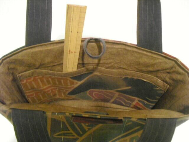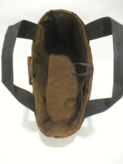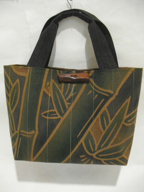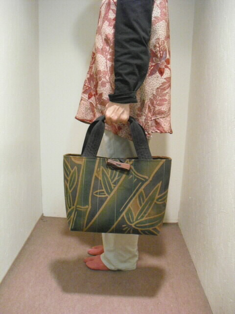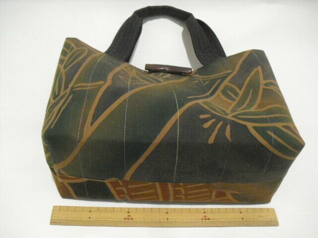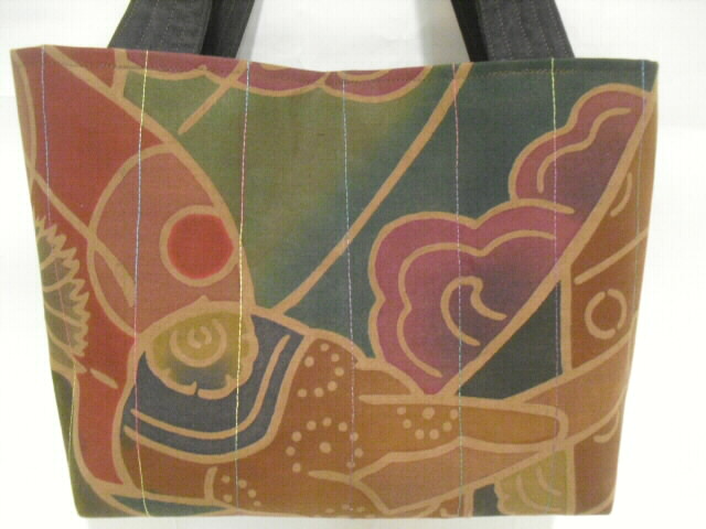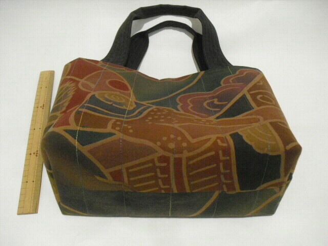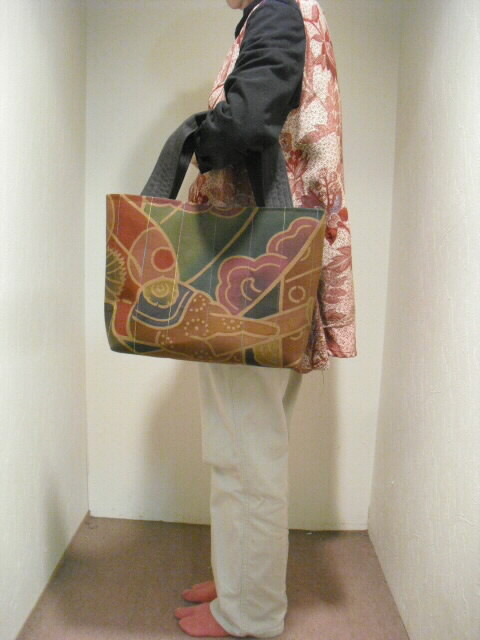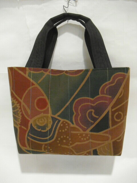 素材・・・バック本体、持ち手:古布 武者絵のぼり旗(綿) サイズ・・・幅29cm×高さ24cm×底幅12.5cm持ち手・・・長さ40cm重さ・・・425g特徴・・・古布の武者絵幟旗を染色して手さげバックへリメイクしました。古布の幟旗は大変、希少価値の高い素材です。表と裏は、違った絵柄になっていますので両面で違う表情も楽しめます。バッグ用の硬めの芯を使っていますのでカッチリとしっかりしています。開け口はボタンで留められます。木のボタンがバッグにとてもマッチ♪開け口は大きく開きますので大きな荷物も持ち運びできます。中には深さ14cmのポケットが2個付いています。ちょっとしたお出かけやご旅行に・・・周りの視線を惹きつける個性的なデザイン♪お洒落な手づくり一点モノのバックです。価格 9,800円