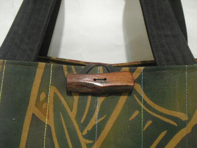 中には深さ14cmのポケットが2個付いています。開け口はボタンで留められます。木のボタンがバッグにとてもマッチ♪