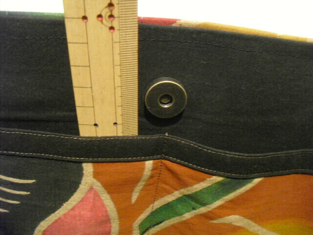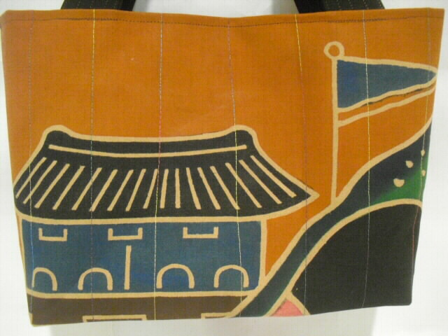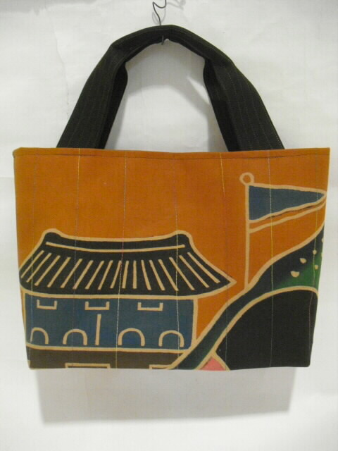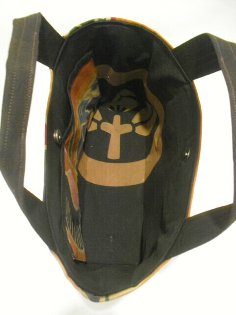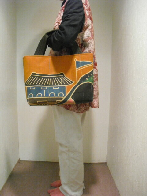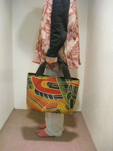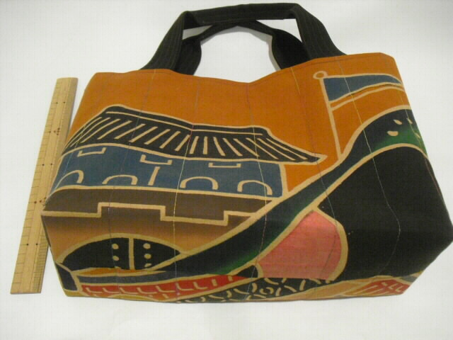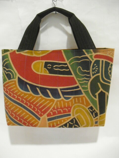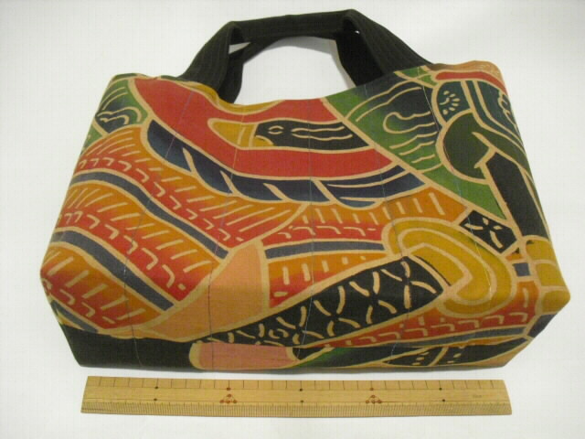 素材・・・バック本体、持ち手:古布 武者絵のぼり旗(綿) サイズ・・・幅31cm×高さ24cm×底幅11cm持ち手・・・長さ40cm重さ・・・255g特徴・・・古布の武者絵幟旗を染色して手さげバックへリメイクしました。古布の幟旗は大変、希少価値の高い素材です。表と裏は、違った絵柄になっていますので両面で違う表情も楽しめます。バッグ用の硬めの芯を使っていますのでカッチリとしっかりしています。開け口は開閉が楽なマグネットボタン式です。開け口は大きく開きますので大きな荷物も持ち運びできます。中には深さ15cmのポケットが2個付いています。ちょっとしたお出かけやご旅行に・・・周りの視線を惹きつける個性的なデザイン♪お洒落な手づくり一点モノのバックです。価格 9,800円