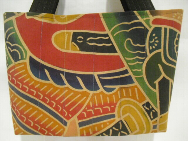 古布の武者絵幟旗を染色して手さげバックへリメイクしました。古布の幟旗は大変、希少価値の高い素材です。表と裏は、違った絵柄になっていますので両面で違う表情も楽しめます。