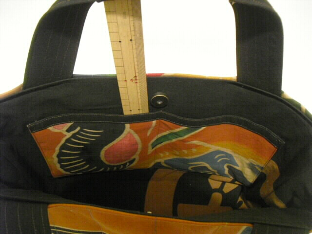 バッグ用の硬めの芯を使っていますのでカッチリとしっかりしています。開け口は大きく開きますので大きな荷物も持ち運びできます。中には深さ15cmのポケットが2個付いています。
