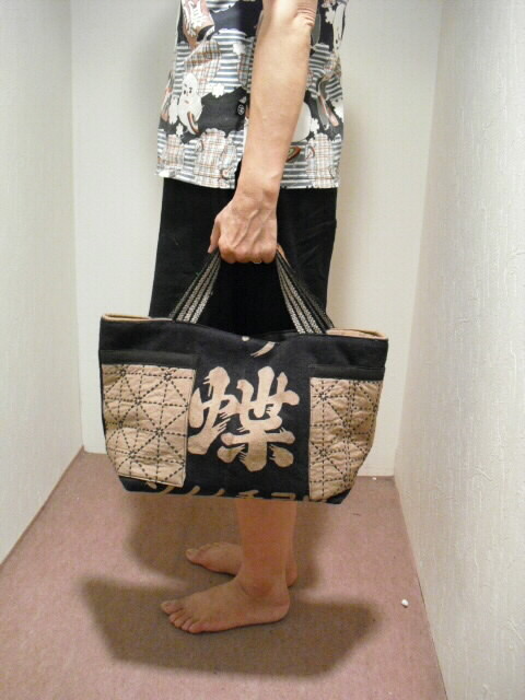 素材・・・古布 前掛け(綿100%)サイズ・・・幅23cm×高さ34cm×底幅15cm持ち手・・・幅3cm、長さ34cm特徴・・・古布の前掛けを染色してバックへリメイクした作品です。生地の厚みもあり、とても丈夫なバッグです。表と裏は違った絵柄になっていますので両面で違う表情が楽しめます。持ち手は前掛けの紐で作りました。柔らかい手触りです。片面には手をかけて刺し子をした別布を当てて貼付ポケットを2個付けています。ポケットの大きさは深さ16cm×幅12cm、深さ16cm×幅14cmです。留め口はマグネットボタン式です。内布には幟旗を使いました。中には深さ18cm×幅23cmの大き目のポケットを付けています。こちらのポケットにも刺し子がしてあります。底板付きですのでバッグの型崩れを防いでくれます。ちょっとしたお出かけやお買物に・・・周りの視線を惹きつける個性的なデザイン♪お洒落な手づくり一点モノのバックです。価格 6,800円