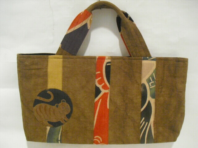 素材・・・バック本体と持ち手:古布 武者絵のぼり旗(綿100%)サイズ・・・幅38cm×高さ21.5cm×底幅8.5cm持ち手・・・長さ35cm重さ・・・370g特徴・・・古布の武者絵幟旗を染色してバックへリメイクした作品です。古布の幟旗は大変、希少価値の高い素材です。幟旗のリメイクバッグは派手めの作品が多い中、このバッグは表に家紋部分の白無地を使いシンプルで落ち着いた色になっています。ポイントに干支の虎と鳥柄の別布をパッチして遊び心も出しました。武者絵幟の絵柄の部分を縦に組み合わせています。とても面白いアクセントになっています。表と裏は、違った絵柄になっていますので両面で違う表情も楽しめます。芯は入っていますが柔らかい芯ですので折り曲げて持ち運びできます。底板付きです。重い荷物を入れても型崩れを防いでくれます。開け口は開閉が楽なマグネットボタン。大きく開きますので大きな荷物も持ち運びできます。荷物の出し入れがしやすい底の浅い横長バッグ。中に深さ12.5cmのポケットが3個付いています。ご旅行やお買物に・・・周りの視線を惹きつける個性的なデザイン♪お洒落な手づくり一点モノのバックです。価格 9,800円