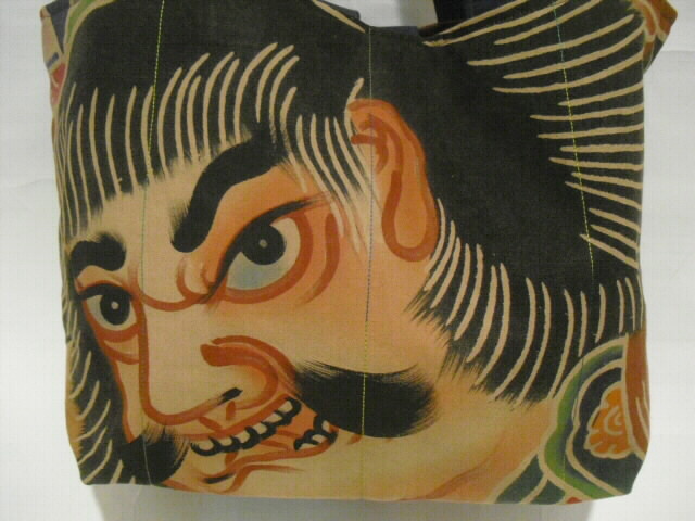 古布の武者絵幟旗を染色して手さげバックへリメイクしました。古布の幟旗は大変、希少価値の高い素材です。周りの視線を惹きつける個性的なデザイン♪表と裏は、違った絵柄になっていますので両面で違う表情も楽しめます。