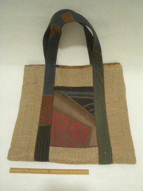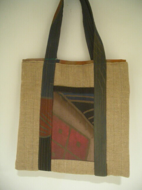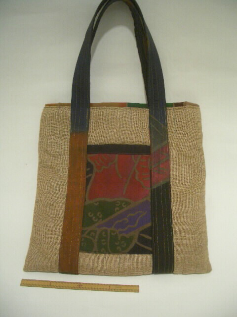 素材・・・バック本体:古布(綿・麻) 、持ち手:古布(綿) サイズ・・・幅33cm×高さ32cm×底幅1cm持ち手・・・長さ46cm特徴・・・染色した古布の武者絵幟旗と蚊帳を組み合わせバックへリメイクした作品です。古布の幟旗・蚊帳は大変、希少価値の高い素材です。表は蚊帳をベースに幟旗をパッチしました。表と裏は、違った絵柄になっていますので両面で違う表情も楽しめます。裏は幟旗を使用しています。芯は入っていますがふわふわした柔らかい手触りです。ポケットは表側に2箇所。中に2箇所ついています。ちょっとしたお出かけやご旅行時のサブバックに・・・周りの視線を惹きつける♪お洒落な手づくり一点モノのバックです。価格 7,000円