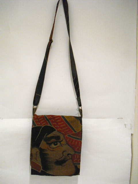 素材・・・バック本体:古布 武者絵のぼり旗(綿100%) 肩ベルト:古布 武者絵のぼり旗(綿100%) サイズ・・・幅19cm×高さ30cm×底幅8cm持ち手・・・長さ89cm〜150cm(調整可能)、 幅 2.7cm特徴・・・古布の武者絵幟旗を染色してバックへリメイクした作品です。古布の幟旗は大変、希少価値の高い素材です。男性にも人気の蓋付きのショルダーバッグです。蓋を開けると大小3個の貼り付けポケット。バッグ中にも大きなポケットが1個付いています。肩ベルトも幟旗で作りました。周りの視線を惹きつける♪お洒落な手づくり一点モノのバックです。価格 11,500円