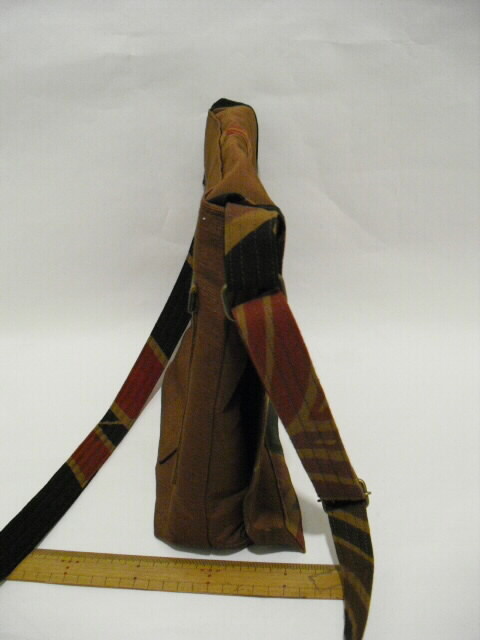 素材・・・古布 武者絵のぼり旗(綿) 古布 帯(絹) サイズ・・・幅25cm×高さ28cm×底幅8cm持ち手・・・長さ89cm〜150cm(調整可能)、 幅 2.7cm特徴・・・帯と染色した武者絵幟旗を組合わせてバックへリメイクしました。女性にも男性にも人気の蓋付きのショルダーバッグです。落ち着いた焦げ茶色の帯地に刺繍された模様がポイントになっています。外側の裏に深さ14cm×幅12cmと深さ14cm×幅11cmの2つのポケット。バッグ中にも深さ16cmの2つのポケットが付いています。全部で4つのポケットは分別収納ができて機能的。長さの調整可能な肩ベルトも幟旗で作りました。周りの視線を惹きつける♪個性輝く、お洒落な手づくり一点モノのバックです。価格 9,500円