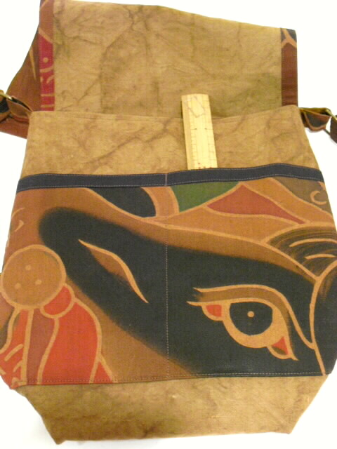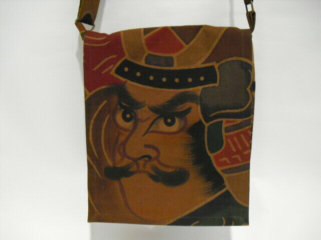 素材・・・バック本体:古布 武者絵のぼり旗(綿100%) 肩ベルト:古布 武者絵のぼり旗(綿100%) サイズ・・・幅30cm×高さ32cm×底幅13cm持ち手・・・長さ89cm〜150cm(調整可能)、 幅 2.7cm特徴・・・古布の武者絵幟旗を染色してバックへリメイクした作品です。古布の幟旗は大変、希少価値の高い素材です。男性にも人気の蓋付きのショルダーバッグです。外側の裏に深さ14cm×幅11cmと深さ17cm×幅12cmの2つのポケット。蓋を開けると深さ19cm×幅14cmの2つのポケット。バッグ中にも深さ19cm×幅16cmのポケットが1つ付いています。全部で5つのポケットは分別収納ができて機能的。底板つきですのでバッグの型崩れを防ぎます。長さの調整可能な肩ベルトも幟旗で作りました。周りの視線を惹きつける♪個性輝く、お洒落な手づくり一点モノのバックです。価格 11,500円