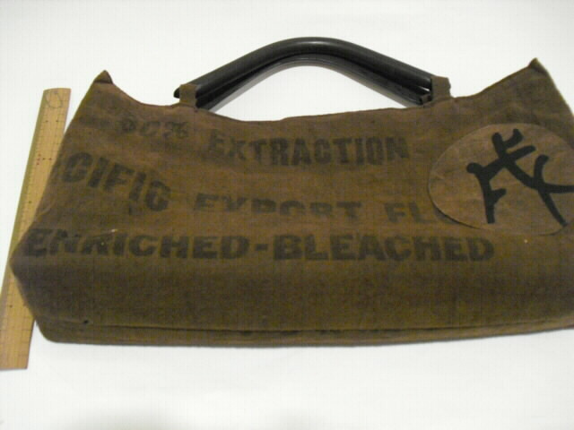 素材・・・綿100%サイズ・・・幅43cm×高さ22cm×底幅8cm持ち手・・・木 (長さ34cm)特徴・・・和と洋のコラボレーションバッグです。表は英字が書かれた綿生地へ漢字の生地を組合せ裏地は武者絵のぼりを使っています。とても個性的でも面白く仕上がっています。幟旗のリメイクバッグは派手めの作品が多い中、このバッグは裏地に幟旗を使い表はシンプルで落ち着いた色とデザインになっています。芯は入っていますがふわふわした柔らかい手触りです。開け口はマグネットボタン。大きく開きますので大きな荷物も持ち運びできます。荷物の出し入れがしやすい底の浅い横長バッグ。ポケットは中に2箇所(幅11cm、深さ14cm)と(幅25cm、深さ18cm)。底板付きですので重いものを入れても型崩れを防ぎます。ご旅行やお買物に・・・周りの視線を惹きつける個性的なデザイン♪お洒落な手づくり一点モノのバックです。価格 9,500円