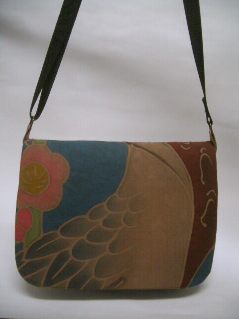 素材・・・バック本体:古布(綿100%) 、肩ベルト:アクリル 100%サイズ・・・幅24cm×高さ25m×底幅12cm持ち手・・・アクリルテープ 長さ76cm〜131cm、幅 3cm特徴・・・古布の武者絵幟旗を染色してバックへリメイクした作品です。古布の幟旗は大変、希少価値の高い素材です。芯は入っていますがふわふわした柔らかい手触りです。ポケットは裏側に2箇所、内側に1箇所ついています。底板もついています。ちょっとしたお出かけやご旅行時のサブバックに・・・周りの視線を惹きつける♪お洒落な手づくり一点モノのバックです。価格 9,500円
