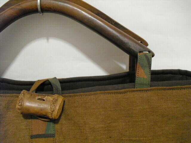 素材・・・バック本体:古布 武者絵のぼり旗(綿100%) 、持ち手:木 サイズ・・・幅45cm×高さ26cm×底幅12cm持ち手・・・長さ35cm特徴・・・古布の武者絵幟旗を染色してバックへリメイクした作品です。古布の幟旗は大変、希少価値の高い素材です。表と裏は、違った絵柄になっていますので両面で違う表情も楽しめます。芯は入っていますがふわふわした柔らかい手触りです。開け口は竹のボタンで留められます。大きな竹が面白いポイントになっています。大きく開きますので大きな荷物も持ち運びできます。バッグの表周り全体が貼り付けポケットになっています。5箇所で仕切り縫いをしていますので分別収納にも便利です。ポケットは中にも1箇所(幅18cm、深さ18cm)底板付きですので重い物を入れても型崩れを防いでくれます。ちょっとしたお出かけやご旅行に・・・周りの視線を惹きつける個性的なデザイン♪お洒落な手づくり一点モノのバックです。価格 9,500円