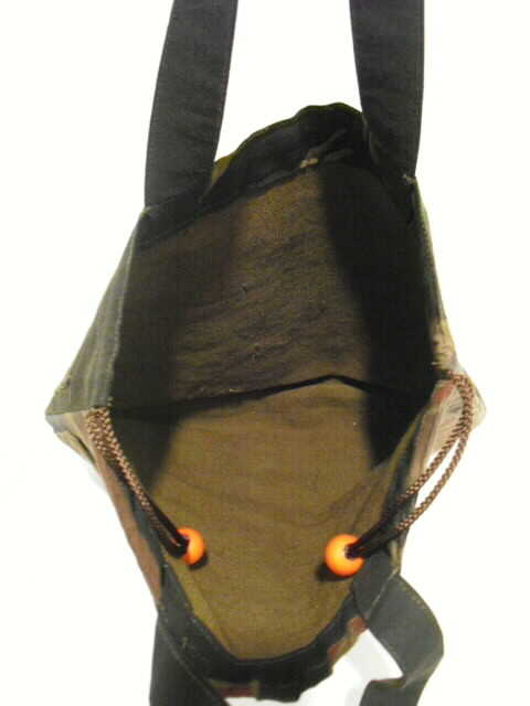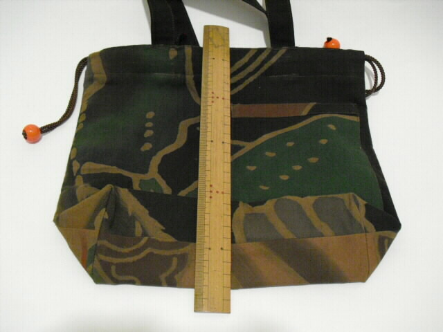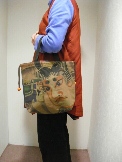 素材・・・古布 武者絵のぼり旗(綿100%) サイズ・・・幅21cm×高さ25cm×底幅8cm持ち手・・・長さ35cm、幅 2.5cm特徴・・・古布の武者絵幟旗を染色してバックへリメイクした作品です。古布の幟旗は大変、希少価値の高い素材です。形は普通の手さげバッグですが上部のひもを結べば巾着バッグにもなります。表と裏は、違った絵柄になっていますので両面で違う表情も楽しめます。柔らかい手触りです。芯は入っていませんので小さく折りたたんで携行できます。ポケットは外側に深さ11cm×幅11cmと深さ16cm×幅12cmが付いています。ちょっとしたお出かけやご旅行時のサブバッグに。周りの視線を惹きつける♪お洒落な手づくり一点モノのバックです。価格 3,800円