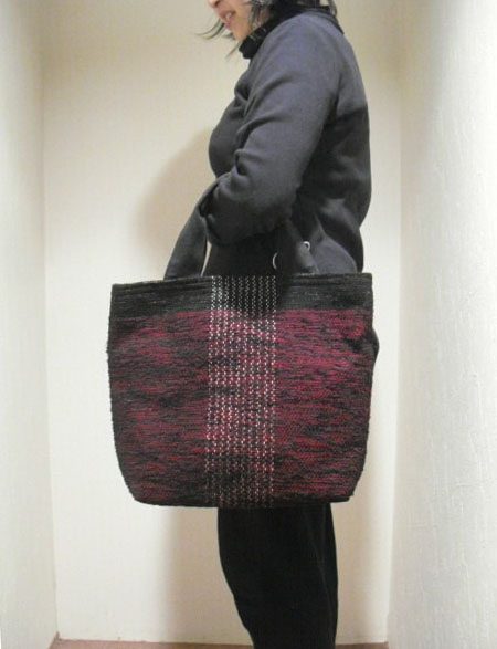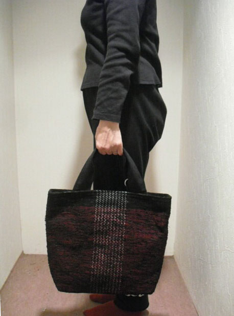 裂き織り布には、厚めの芯が張ってありますのでしっかりした感じのバッグになっています。