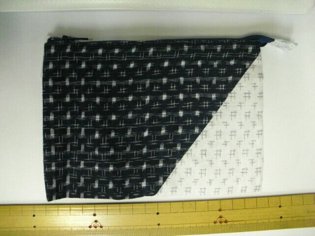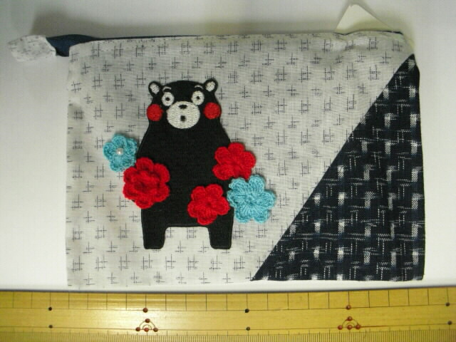 絣(かすり)の生地に人気のくまモンの布・ワッペンをポーチに付けました♪