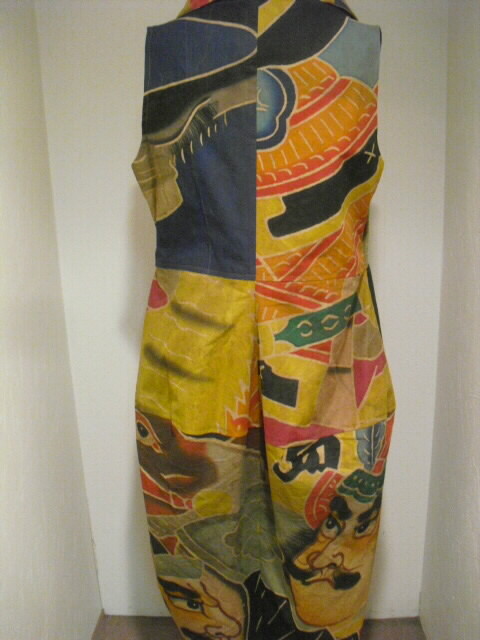 前の左胸、後の裾に武者の顔を配置しました。 周りの視線を惹きつける個性輝くお洋服です。 前はウエストの下15cmから衿までの長めのファスナー開き。 脱ぎ着しやすいように長さ58cmのオープンファスナーを使いました。 スッポリかぶれるデザインです。