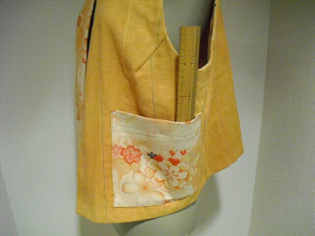 オレンジの着物地から作ったベストです。 花柄の可愛い絵柄です。 ガーゼのように柔らかく、優しい手触りです。