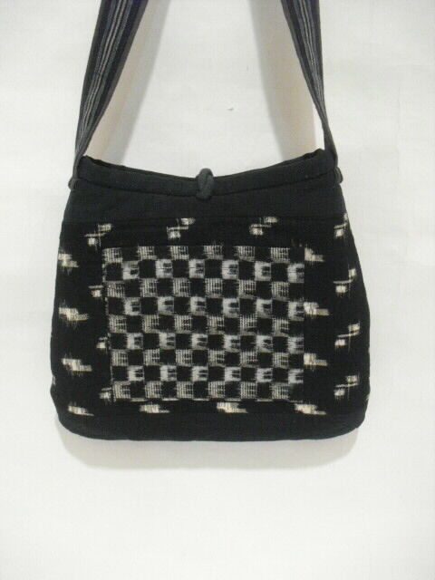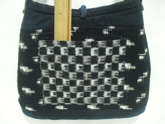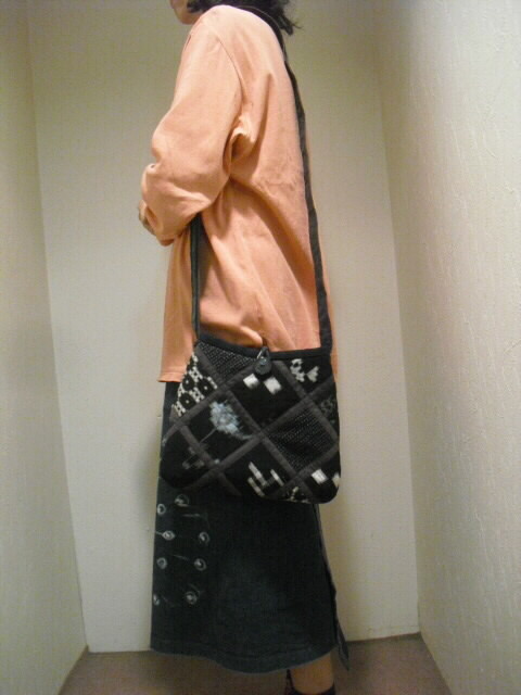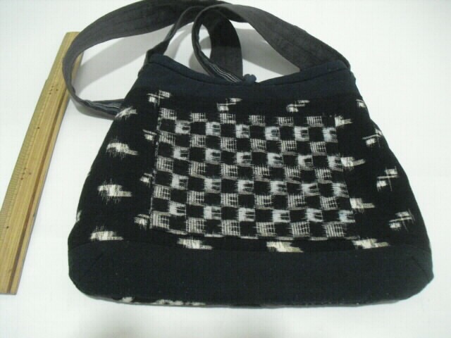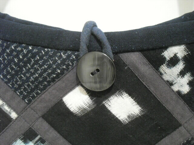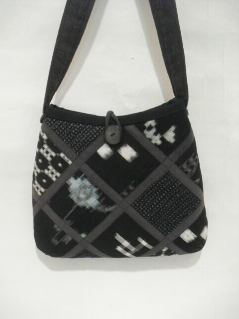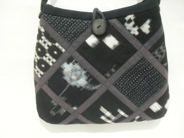 数種類の着物を使いショルダーバック(ポシェット)へリメイクしました。 藍染めの着物をベースに絣の着物を多く組合わせています。 高価な素材を使い、時間をかけて丁寧にお仕立てしました。 手のかかったパッチワークで独自のデザインにこだわりながら着物の柄を生かしました。 表に口幅14cm、深さ11cmのポケットが付いています。 開け口はボタンで留めるタイプです。 表と裏は、まったく違うデザインにしていますので両面で違う表情も楽しめます。 芯は入っていますがふわふわした柔らかい手触りです。 折り曲げる事も出来ますのでご旅行時のサブバッグとしても携行できます。 ポケットは中にも1個付いています。