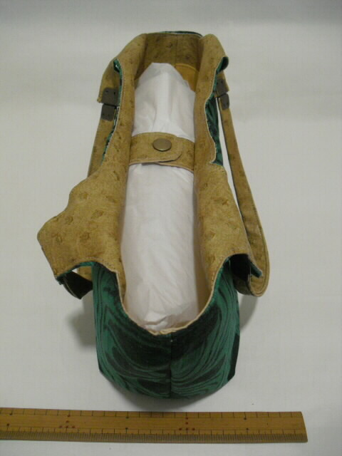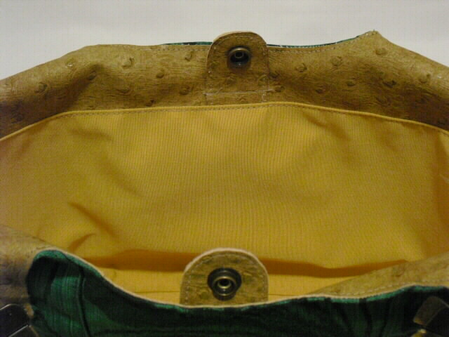 素材・・・帯(絹)、合皮(オーストリッチ風型押し)サイズ・・・幅40cm×高さ18cm×底幅12cm持ち手・・・合皮 幅 2cm× 長さ 32cm特徴・・・帯と合皮をコラボレーションした手作り一点もののトートーバッグです。帯は緑色の落ち着いた色合いの生地です。和装にも洋装にも合います♪使用している合皮はジェラード オーストリッチ柄プリント押しです。大変柔らかく、風合いがソフトです。持ち手もおそろいの素材で作りました。重さ305グラムと大変に軽いのも嬉しいです。表には深さ12cm×幅13cmのポケットが付いています。中にはフリル飾りをつけた深さ11cm×幅 2cm、 8cm、 11cmの大小のポケットが3つあります。開閉はホックボタンタイプです。底板が付いていますので型崩れを防いでくれます。底鋲もつけています。ちょっとしたお出かけやお買物、ご旅行に・・・落ち着いた色合いですので、フォーマルでもカジュアルでも・・・オールマィティに使える個性豊かなバックです。価格 12,800円