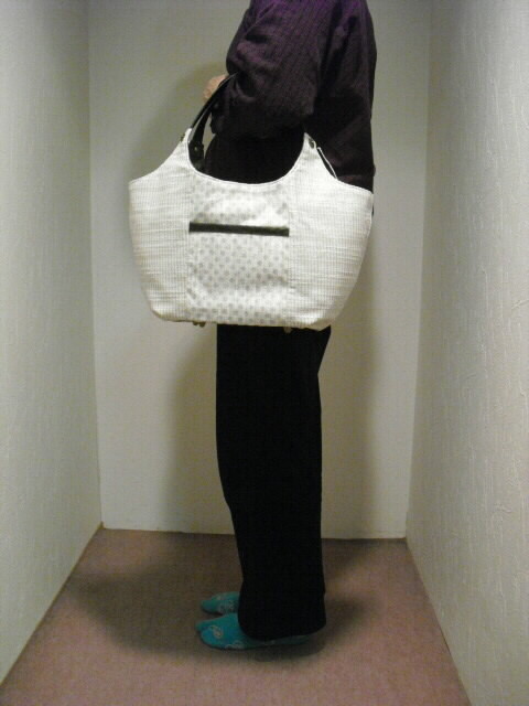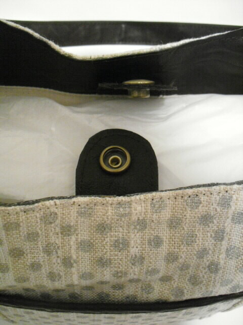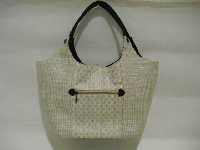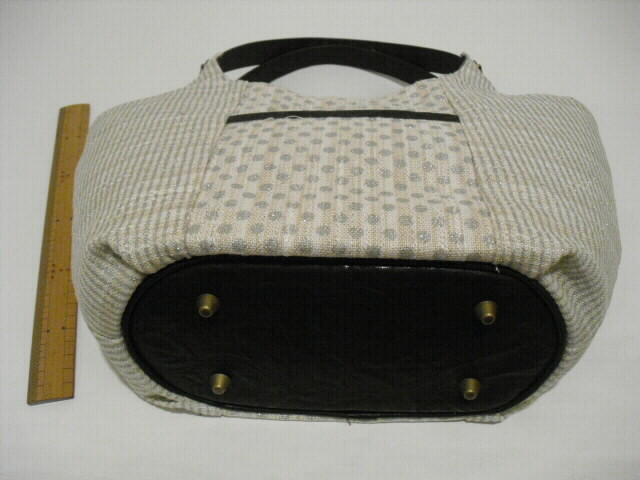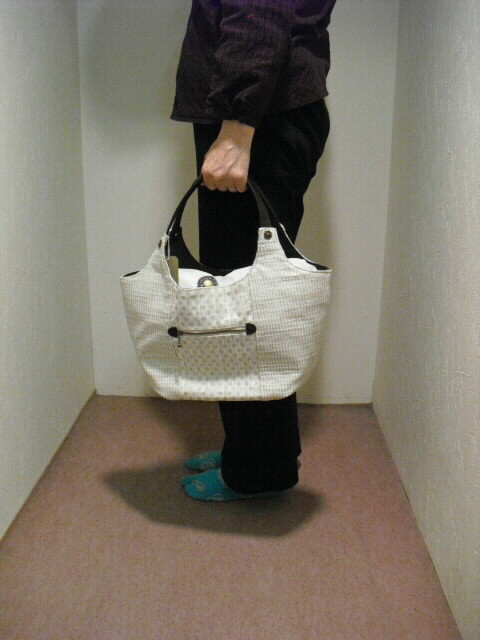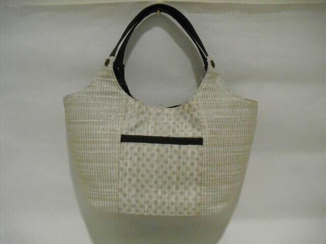 使用した生地は綿、麻の表面にラメドットプリントした生地です。使った合皮は大変柔らかく、風合いがソフトです。もち手も同じ合皮をカットして作りました。