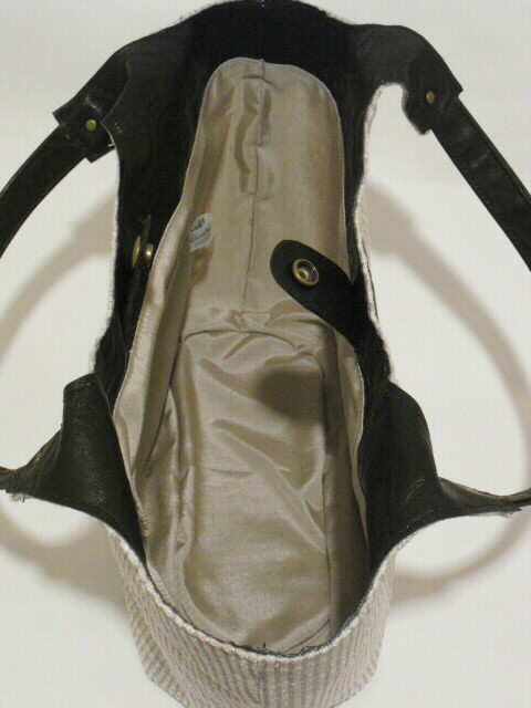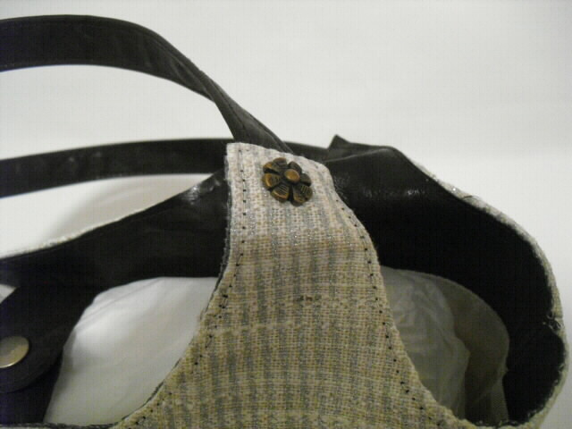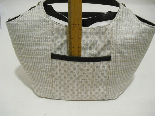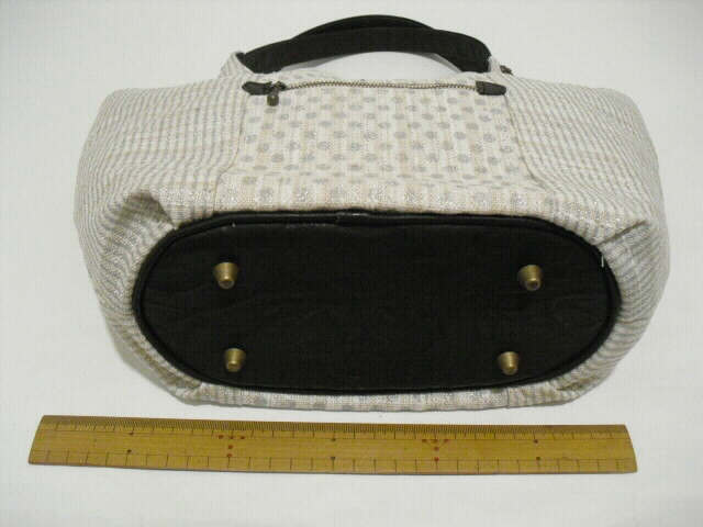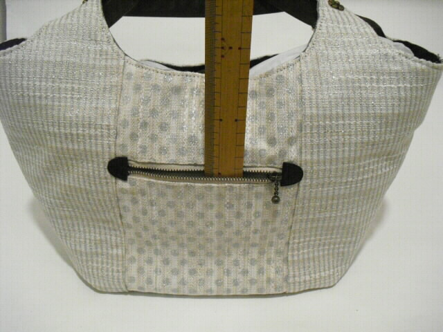 表には深さ12cm×幅13cmのポケット、深さ10cm×幅11cmのファスナーポケットが付いています。中にはフリル飾りをつけた深さ11cm×幅 2cm、 8cm、 11cmの大小のポケットが3つあります。開閉はホックボタンタイプです。底板が付いていますので型崩れを防いでくれます。底鋲もつけています。ちょっとしたお出かけやお買物、ご旅行に・・・落ち着いた色合いですので、フォーマルでもカジュアルでも・・・オールマィティに使える個性豊かなバックです。