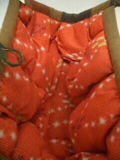素材・・・絣(綿)・武者絵のぼり(綿)サイズ・・・幅 35cm × 高さ 22cm × 底幅 15cm裏・・和裂、ポケット・底板はありません。特徴・・古布の絣と柿渋染めした武者絵のぼりで作りました。 芯は入っていません。ふんわりとした感触が特徴です。 開け口はくるみボタンで留めます。 縦横30cm以上開きますので大きめの荷物も余裕で入ります。 周りの視線をひきつける個性輝く素敵なバックです。価格 6,500円