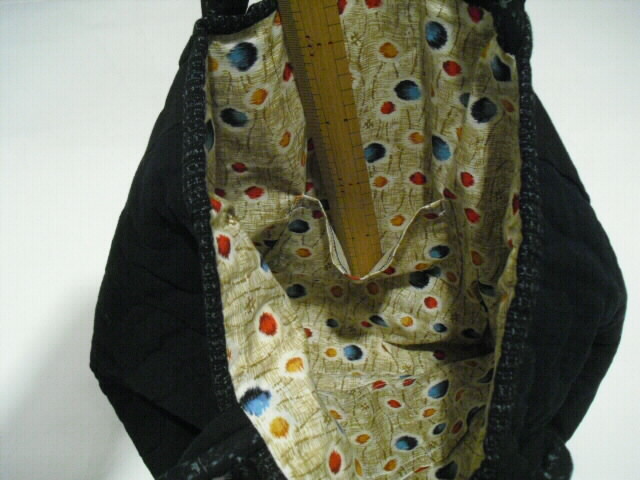 大き目のバッグですが重さは242gと大変軽くなっています。 綿素材ですので柔らかい手触りです。 中にはポケットを3個付けています。 裏地の和布(現代布)も色柄が素敵です。 芯は入っていますが薄い芯です。 小さく折りたたんで携行できますので