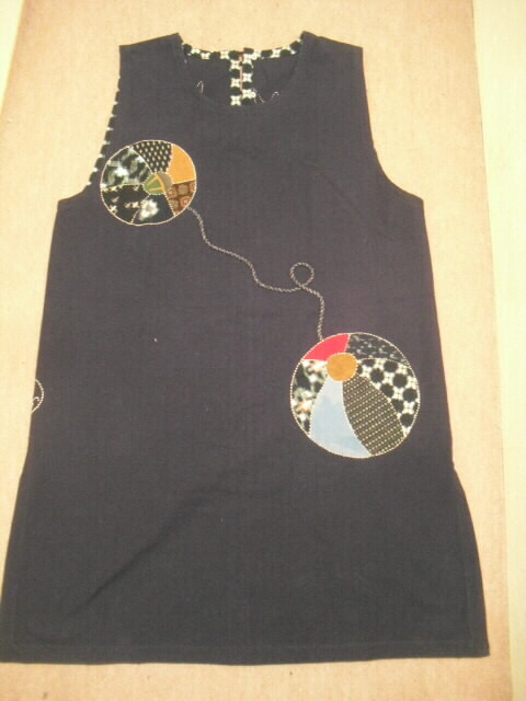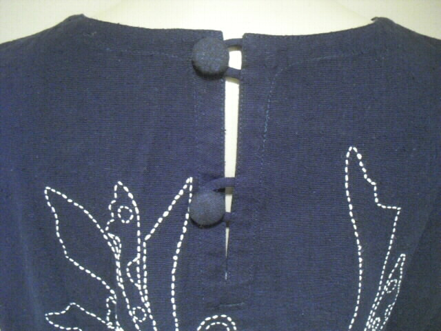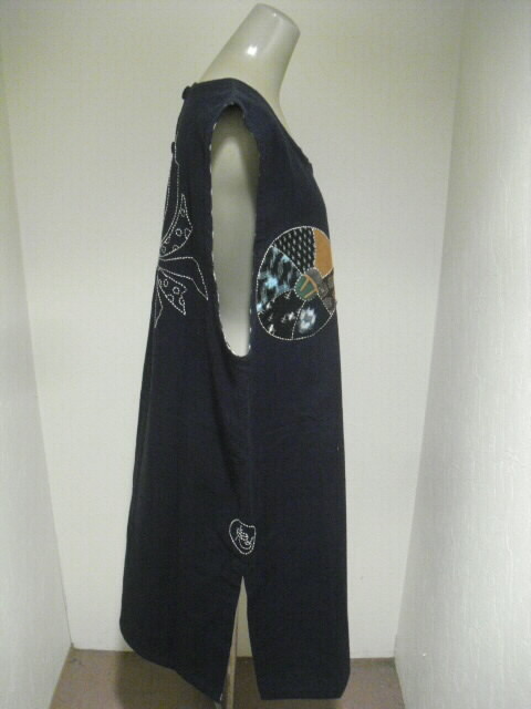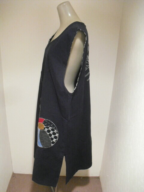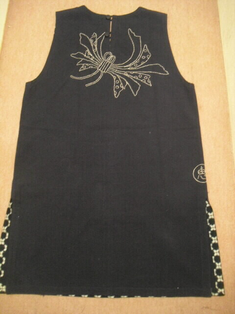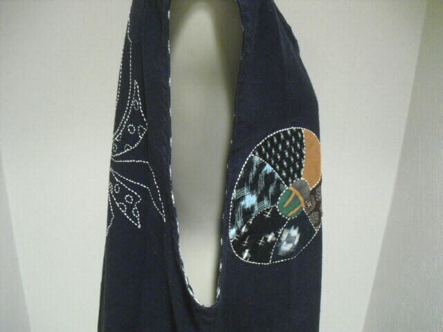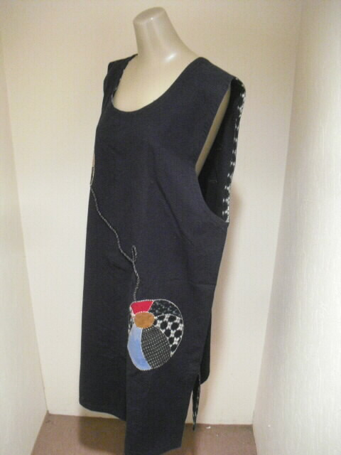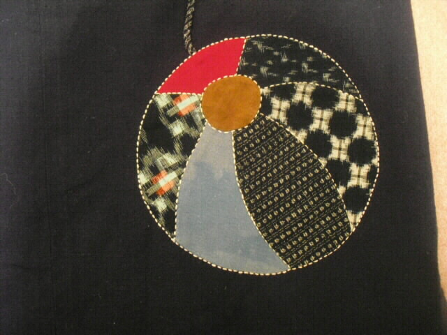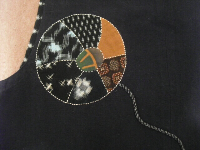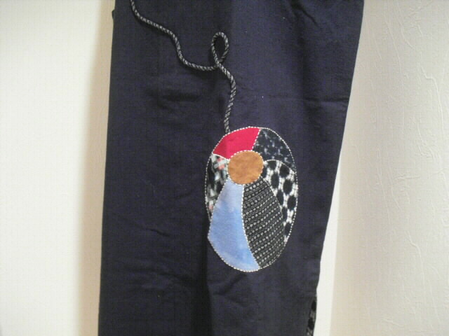 前身頃はポイントに古布をパッチして毬をあしらっています。