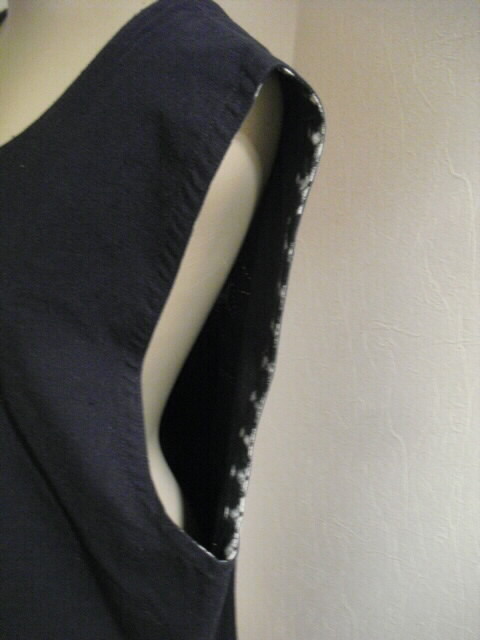 表生地が無地ですので首周り、袖、裾スリットの3カ所の見返しに雪ん子絣を使っています。