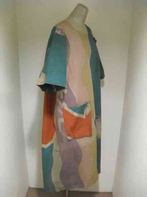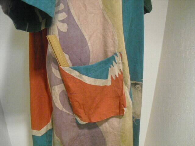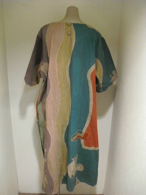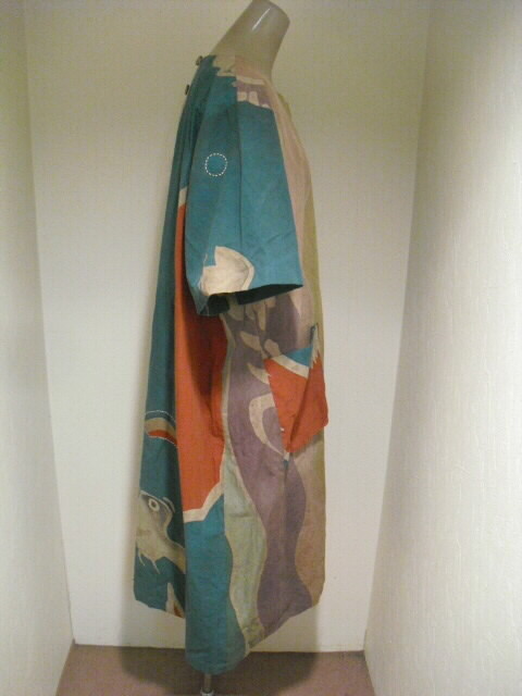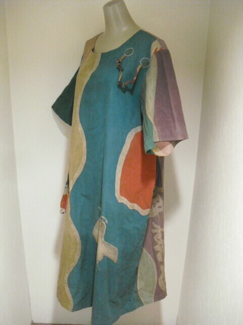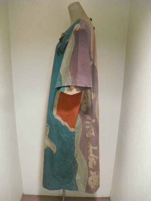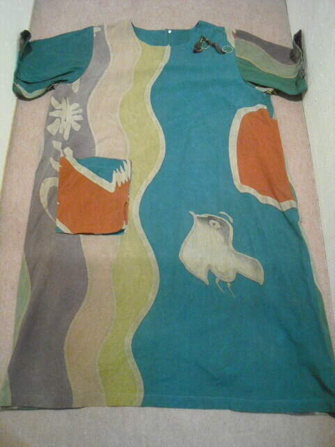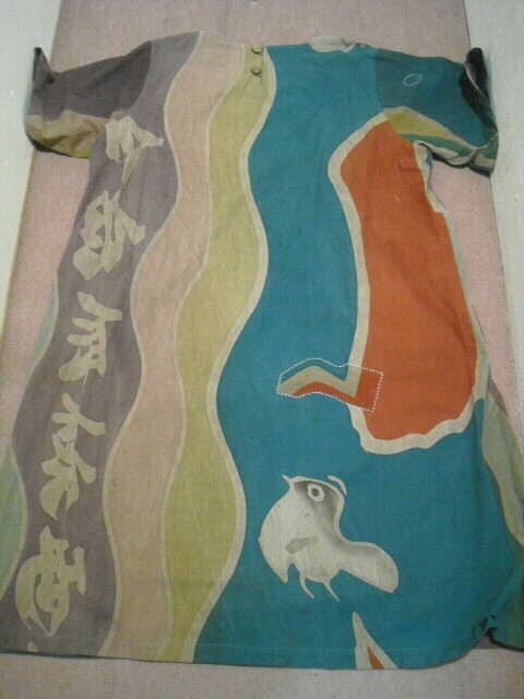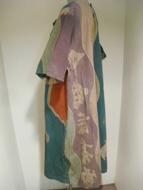 大漁旗をワンピースへリメイクしました。 色合いの派手さを抑えるために柿渋で染色、鉄媒染しています。