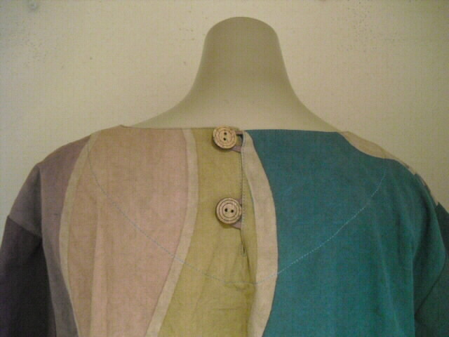 後の衿ぐりに9.5cmの開き口があります。 直径1.8cmの木のボタンを2個付けています。