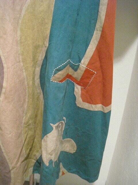 大きな大漁旗を前後共に切替なしで使っています。 前後に千鳥の絵柄を配置。 大漁旗のオリジナルの絵柄をシンプルに生かしました。