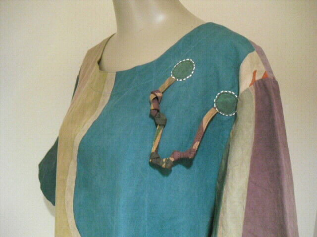 ポケットは左脇に口幅16.5cm×深さ20cmを付けました。 片側(内側)に4cmの幅(マチ)を付けています。 袖は半袖なので重ね着が楽しめます。 シンプルな丸首なので下にハイネックや衿付きのものを着られます。