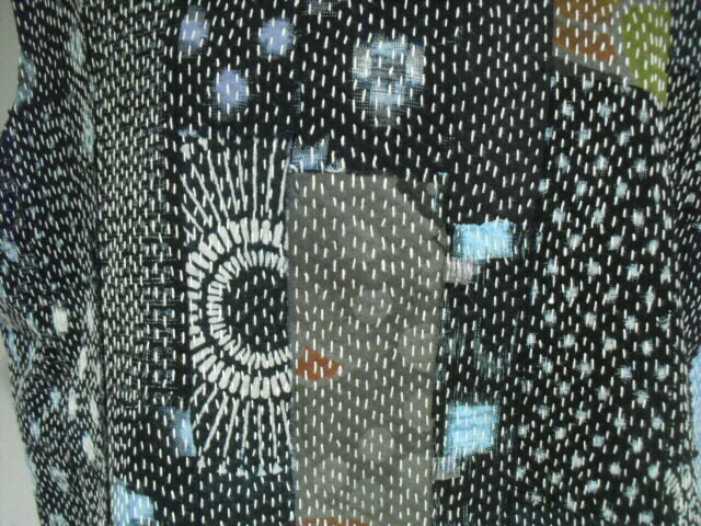 片面は古布の絣、型染め、柿渋染めした武者のぼりを組み合わせて作りました。 素材は綿です。 遊びごころタップリに白い刺し子糸をステッチ風に縫い上げました。 丁寧にひと針、ひと針手間をかけて全体を仕上げました。 時間をかけてお作りしたことが一目で分かります♪